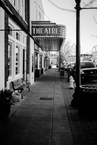 The photograph captures a charming street view featuring a vintage theatre marquee that reads 'THEATRE.' The composition conveys a nostalgic mood, highlighted by the stark contrasts of the black-and-white tones, gently illuminated by natural light, enhancing the inviting atmosphere of the sidewalk lined with benches and storefronts.
