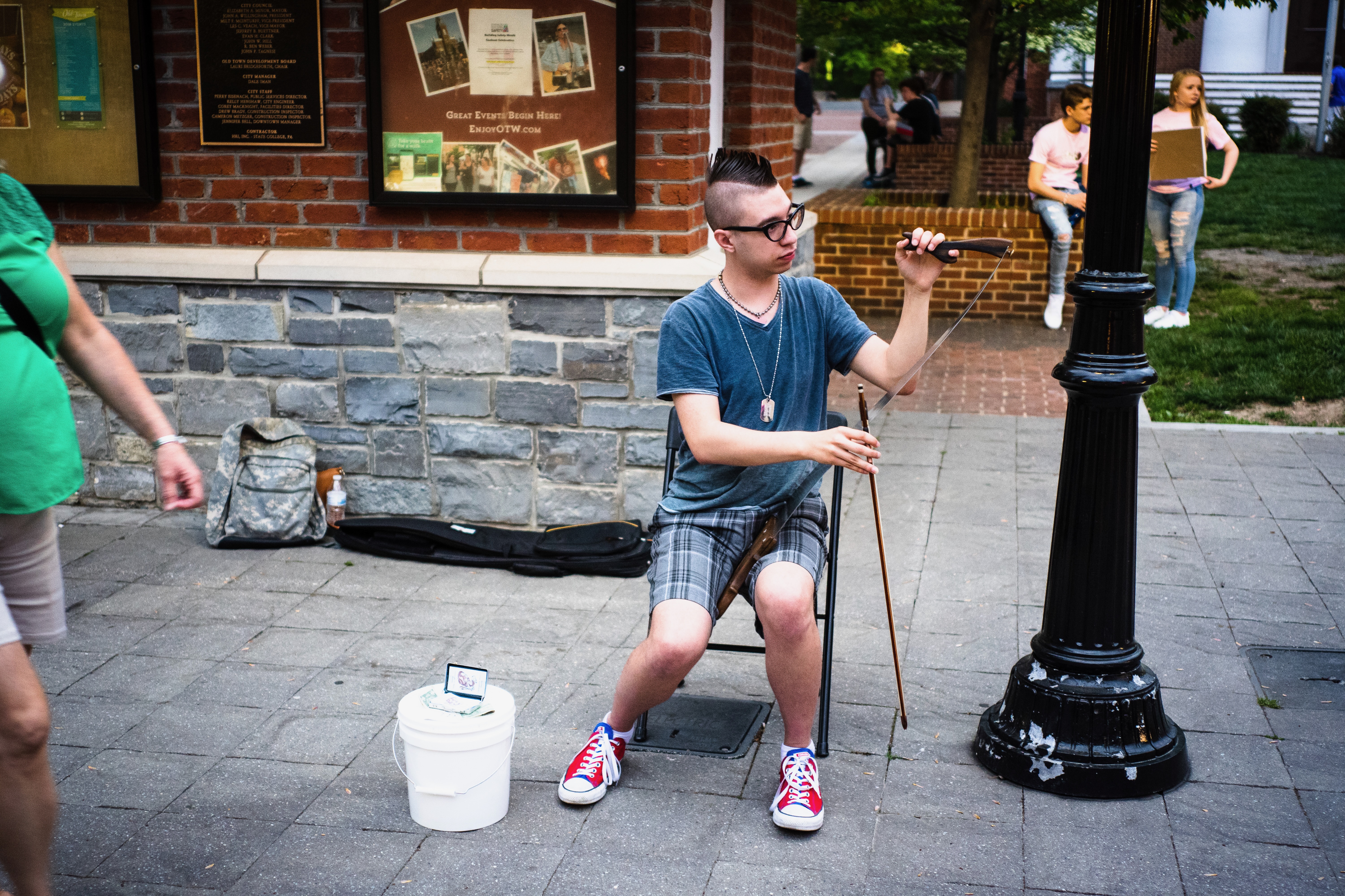 In this vibrant street scene, a young musician sits confidently, playing an instrument with focus and passion. The warm lighting bathes the area, creating a lively mood contrasted by the relaxed demeanor of passersby. His unique style and expressive posture stand out, drawing attention to the art of street performance amidst the urban backdrop.