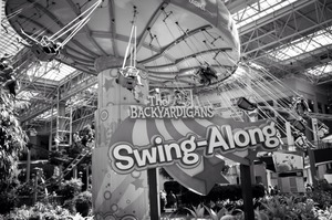 This black and white photograph captures the whimsical Swing-Along ride from The Backyardigans, set within a lively indoor amusement park. The composition highlights the vibrant signage against a backdrop of soaring metal structures, evoking a sense of fun and nostalgia. Soft lighting enhances the playful atmosphere, inviting viewers to reminisce about carefree childhood moments.