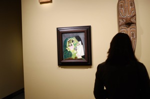 In a softly lit gallery, a visitor stands contemplatively before a vivid abstract painting depicting two intertwined faces, their expressions evoking a complex mix of emotion. The contrasting hues of green and white draw the eye, while a rustic mask completes the eclectic atmosphere, hinting at a dialogue between cultures. The warmth of the yellow walls envelops the scene, creating an intimate space for reflection on the artwork's powerful imagery.