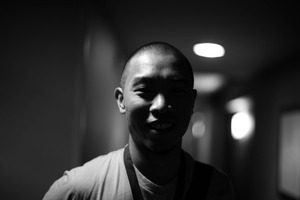 The photograph captures a man smiling softly, his face shrouded in shadow, creating a sense of mystery and intrigue. The background is dimly lit, with subtle highlights that draw the eye, contrasting against his dark silhouette. The overall mood is contemplative yet inviting, emphasizing the interplay of light and darkness.