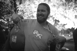 The photograph captures a joyful moment of a man sporting a playful 'djangsta' t-shirt, his wide smile illuminated by the soft glow of ambient lighting. The blurred background hints at a lively gathering, while the subject's enthusiastic gesture conveys warmth and camaraderie. The monochrome palette adds a nostalgic touch, inviting viewers into a cheerful moment shared among friends.