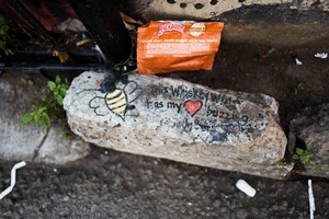 A whimsical stone adorned with a painted bee and heartfelt words captures the essence of urban artistry. Nestled among litter, it juxtaposes the vibrancy of creativity against a backdrop of neglect, evoking a sense of melancholy and charm. Soft, natural lighting highlights the colors, bringing a warmth to this otherwise gritty scene.