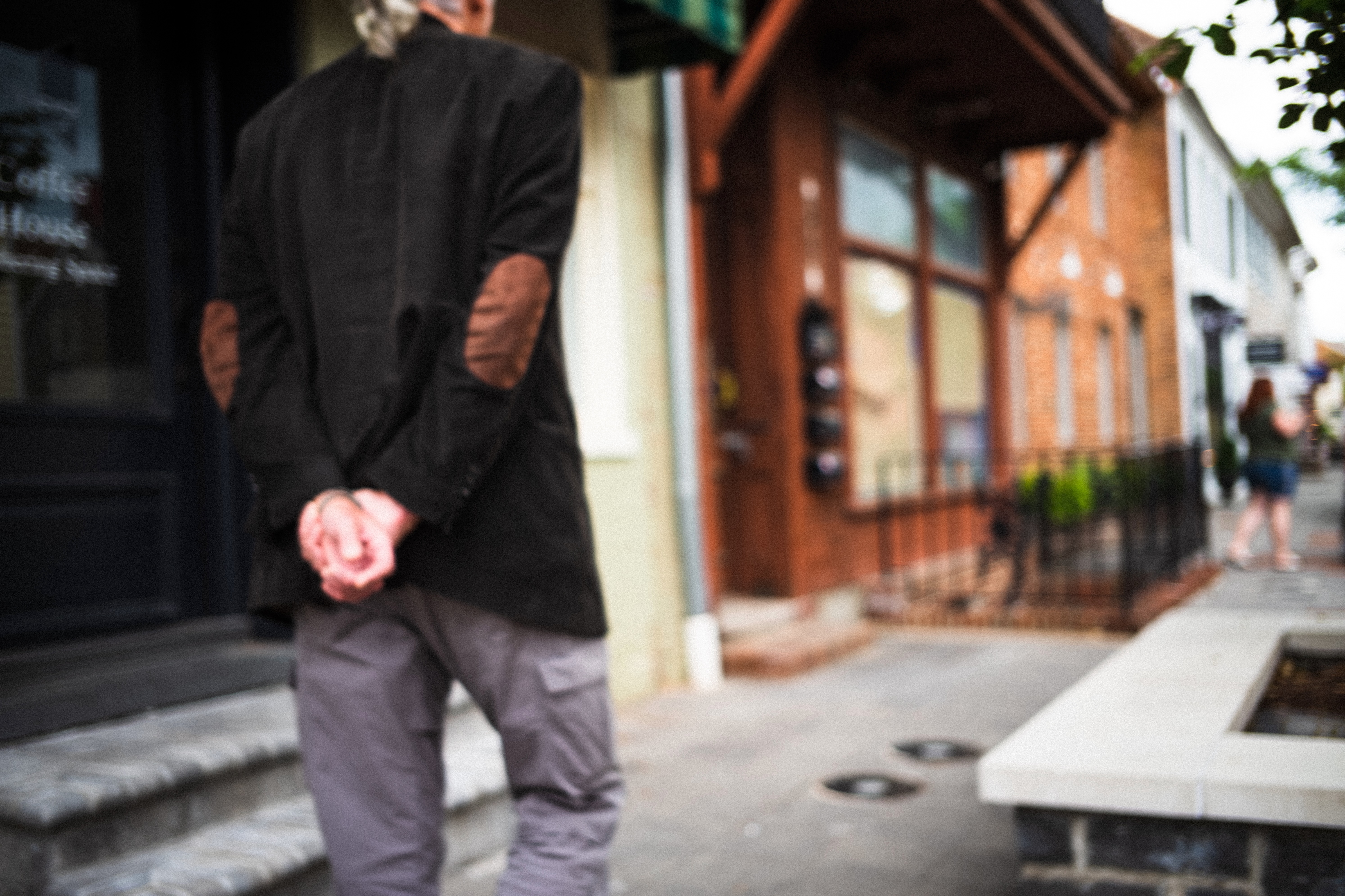 The photograph captures an older man walking away, hands clasped behind him, dressed in a vintage-inspired jacket with elbow patches. Blurry details and soft lighting create a nostalgic mood, contrasting with the vivid colors of the surrounding shops. The composition draws the viewer's focus to the figure's solitary march, evoking a sense of reflection amid a bustling scene.