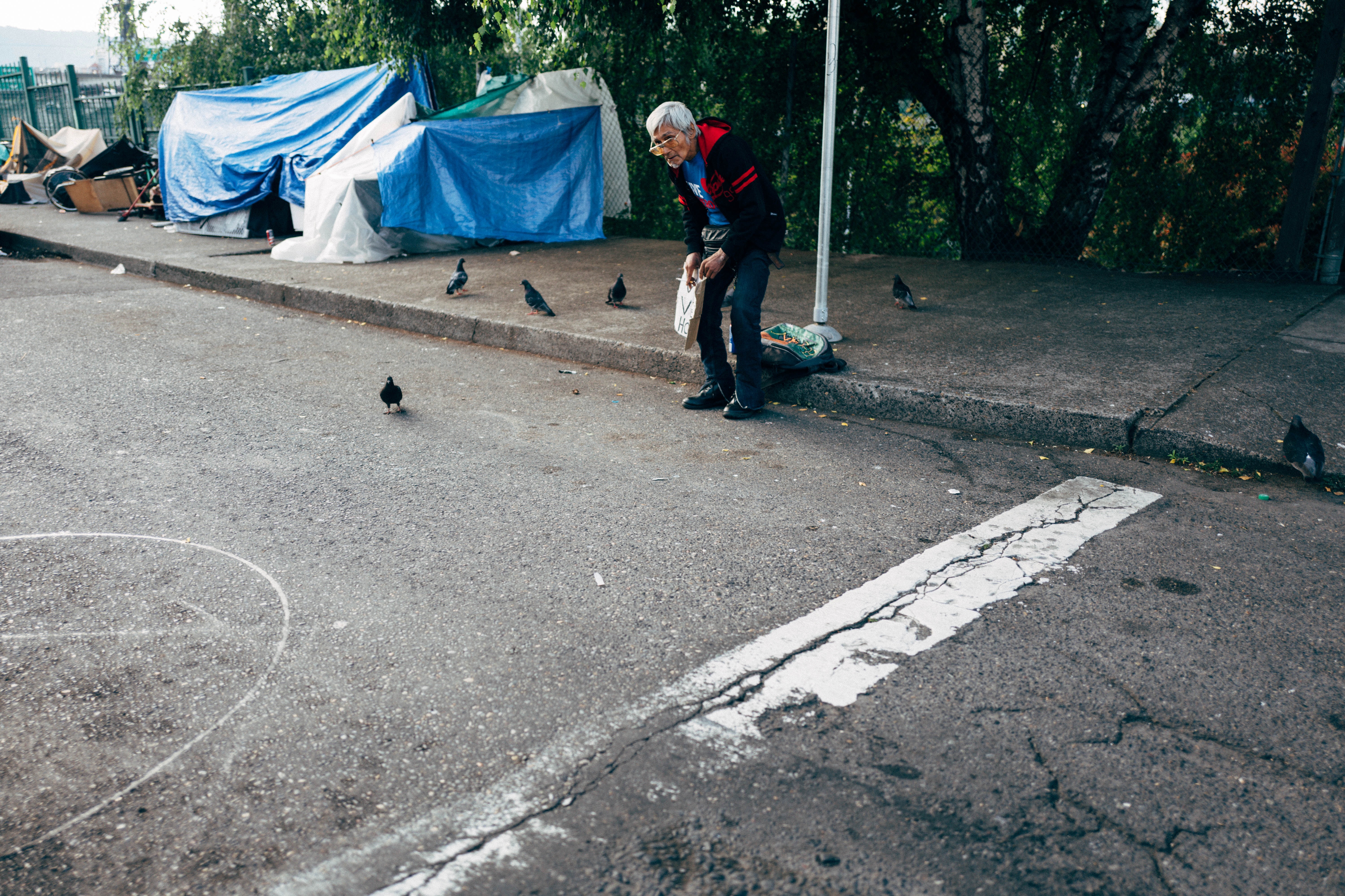 In a quiet, urban setting, an elderly man kneels down to feed a group of pigeons scattered across the cracked pavement. The soft morning light casts a gentle glow, highlighting the man's thoughtful expression and the stark contrast between his solitary act of kindness and the clutter of discarded objects in the background. This image evokes a sense of nostalgia and resilience amidst the challenges of life.