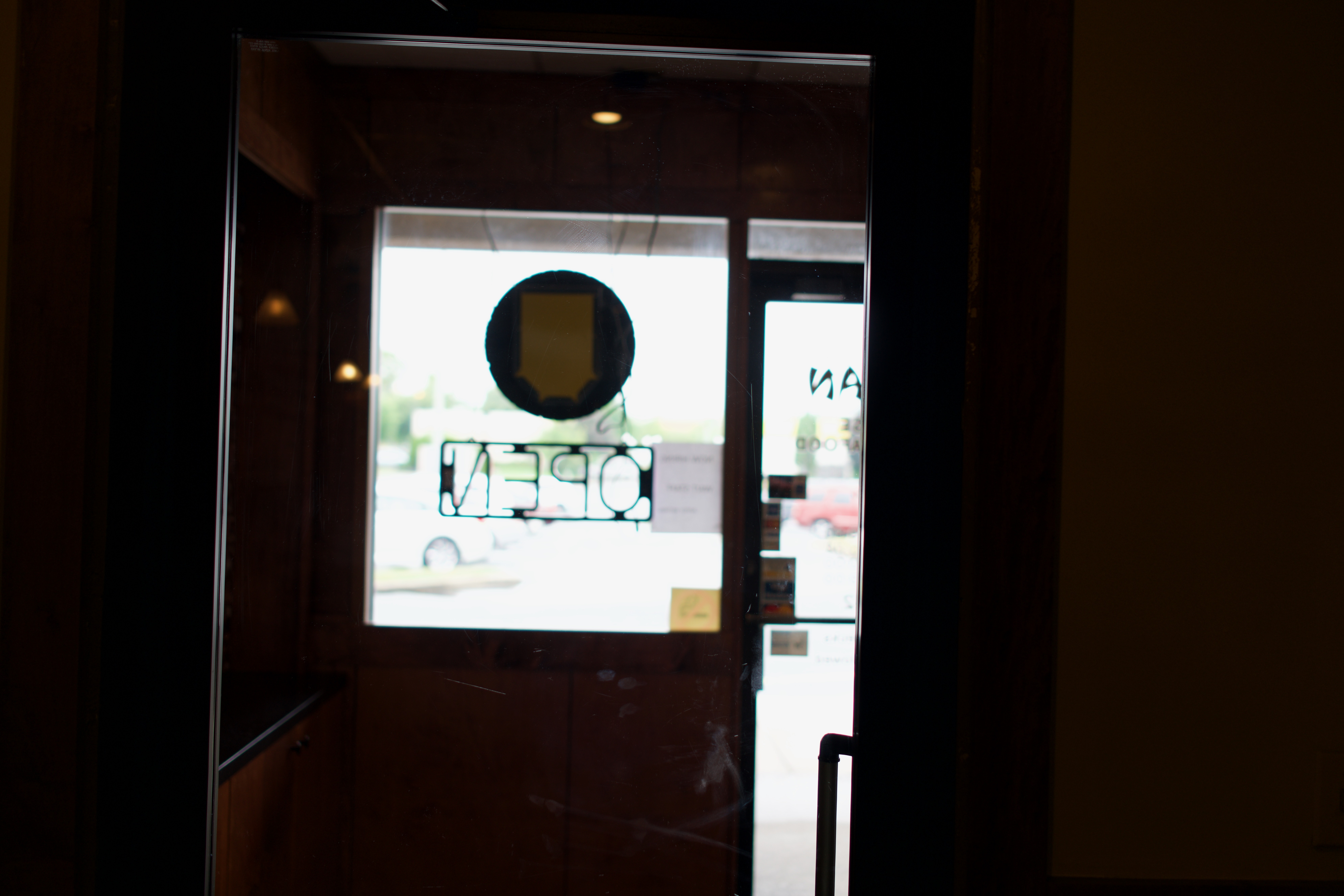 The photograph captures the view through a glass door, where the word 'OPEN' is prominently displayed, inviting and welcoming. The soft, diffused light filters in from the outside, creating a serene and hopeful atmosphere, while reflections and framing add depth to the composition. This image evokes a sense of anticipation and the promise of new experiences waiting just beyond the threshold.