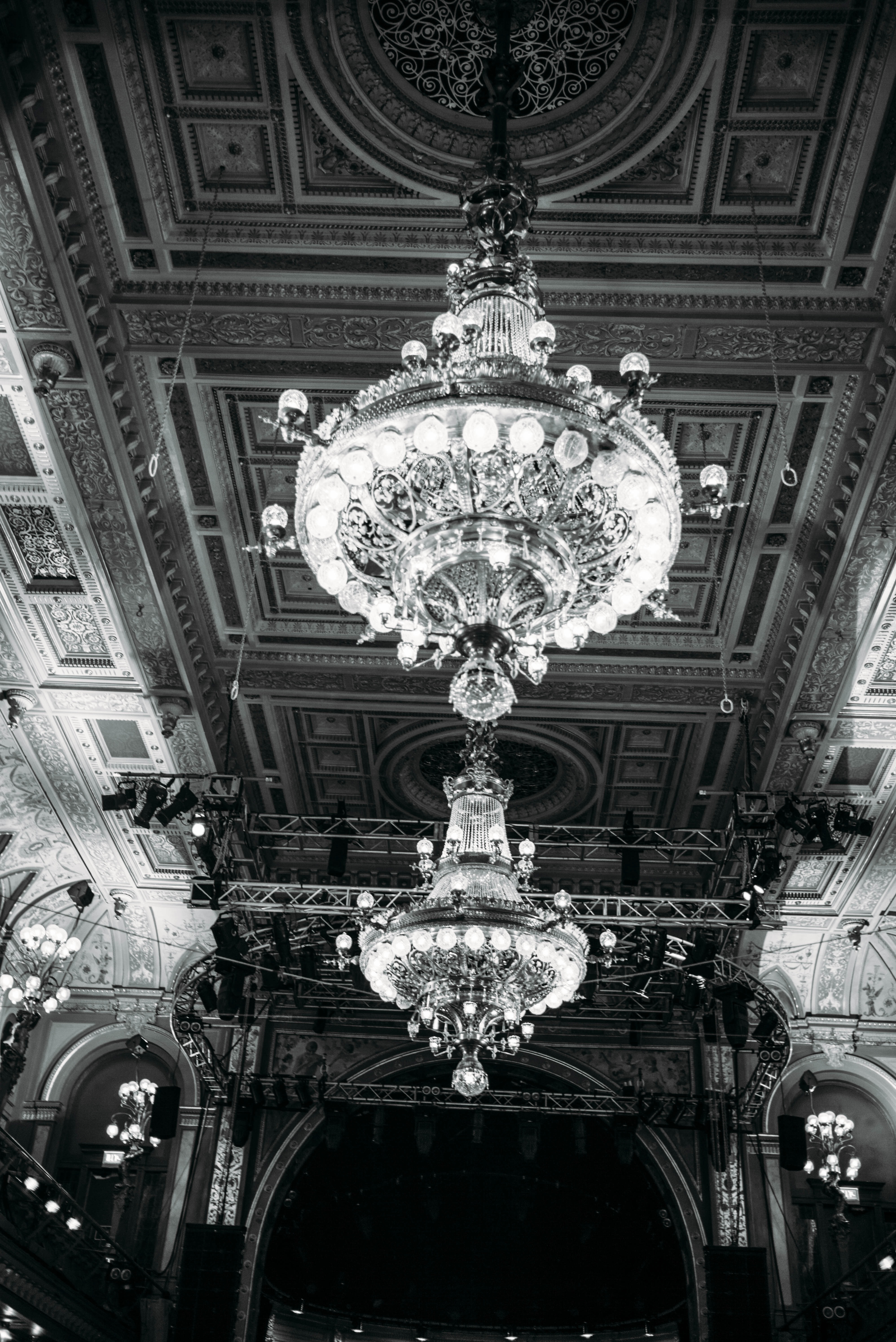 The photograph captures two grand chandeliers suspended from an ornate ceiling, exuding a sense of opulence and history. The interplay of light and shadow enhances the intricate details of the architecture, evoking a dramatic and timeless mood. The monochromatic tones emphasize the elegance of the scene, inviting viewers to appreciate the beauty of the space.