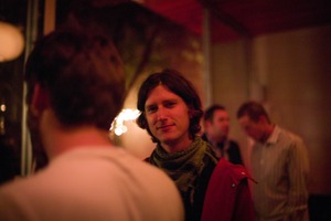 In a dimly lit space, a young man with long, dark hair and a green scarf gazes directly into the camera, exuding a relaxed yet engaging aura. Flashes of warm ambient light and softly blurred figures in the background create a sense of camaraderie and a moody, intimate atmosphere. The composition draws the viewer into the moment, highlighting the subject while hinting at the lively interactions taking place around him.