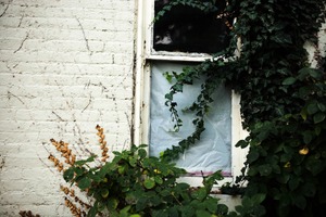 This photograph captures an old window partially obscured by creeping ivy and overgrown foliage, hinting at nature's slow encroachment on human architecture. The muted tones of the weathered brick and dim light create a moody, nostalgic atmosphere, suggesting a story of abandonment and solitude. The vibrant greenery contrasts with the faded white wall, emphasizing the passage of time and the beauty found in decay.