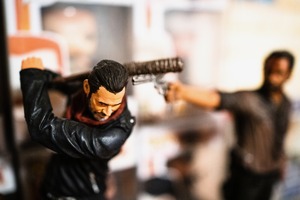 The photograph captures two intricately detailed action figures poised in a dramatic showdown. The stark lighting highlights their expressions and weapons, immersing the viewer in a tense standoff. The blurred background invokes a sense of chaos, enhancing the mood of impending conflict.