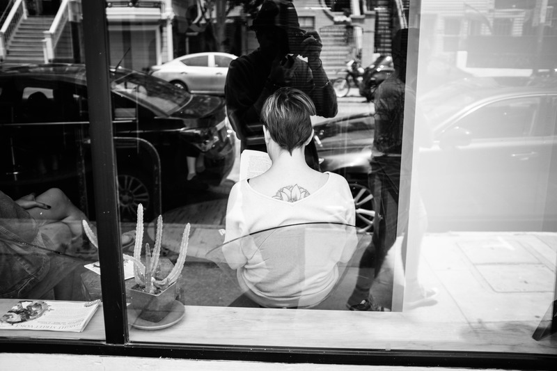 This black-and-white photograph captures a woman engrossed in a book, her back adorned with a delicate tattoo, highlighted by the soft indoor lighting. The scene reflects a blend of interior and exterior life, with the photographer's shadow playfully interjected, creating a layered composition that evokes a sense of quiet introspection amid the bustling world outside. The overall mood is contemplative, inviting viewers to pause and reflect on the juxtaposition of solitude and connectivity.