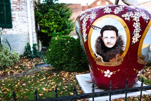 A striking red apple sculpture adorned with a painted portrait of a man, exuding an intriguing mix of charm and curiosity. The surrounding fall foliage enhances the scene's warmth, while the dappled light plays across the glossy surface of the apple, inviting viewers to take a closer look. This unique artwork juxtaposes nature and creativity, creating a whimsical presence in the urban setting.