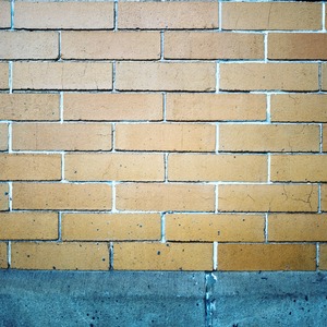 This photograph captures a close-up view of a yellow brick wall, where the even arrangement of bricks creates a rhythmic pattern. The subtle cracks and imperfections give it a sense of character, while the contrasting gray base adds depth. Soft, natural lighting highlights the surface texture, evoking a mood of quiet resilience and urban beauty.