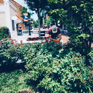 A gardener is focused on pruning blooming roses, their vibrant colors contrasting with the lush greenery surrounding them. The scene captures the peacefulness of a sunny day, with soft shadows cast by the trees. The composition invites viewers into a serene moment of cultivation and care in the heart of a bustling area.
