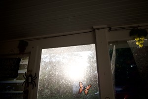 The photograph captures a warm, nostalgic atmosphere as sunlight streams through a dusty glass door, casting a gentle glow. Silhouetted objects, including a delicate butterfly and grape decor, frame the scene, evoking a sense of home and tranquility. The soft focus of the dust adds a dreamy quality, enhancing the mood of quiet introspection.
