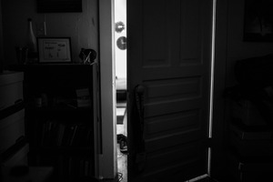 This photograph captures a dimly lit doorway, creating a striking contrast between the darkened foreground and the soft glow emanating from the room beyond. The composition draws the eye toward the light, suggesting a sense of mystery and inviting contemplation about what lies within. The use of black and white enhances the mood, evoking feelings of solitude and introspection.