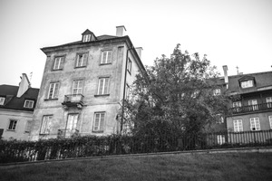 The photograph captures an old, weathered building standing stoically against the evening sky, highlighting its faded charm and historical significance. Surrounding greenery and the gentle slope create a sense of intimacy, drawing the eye upward to the intricate rooflines of nearby structures. The black-and-white palette enhances the mood of nostalgia and quiet reflection, inviting viewers to ponder the stories held within its walls.