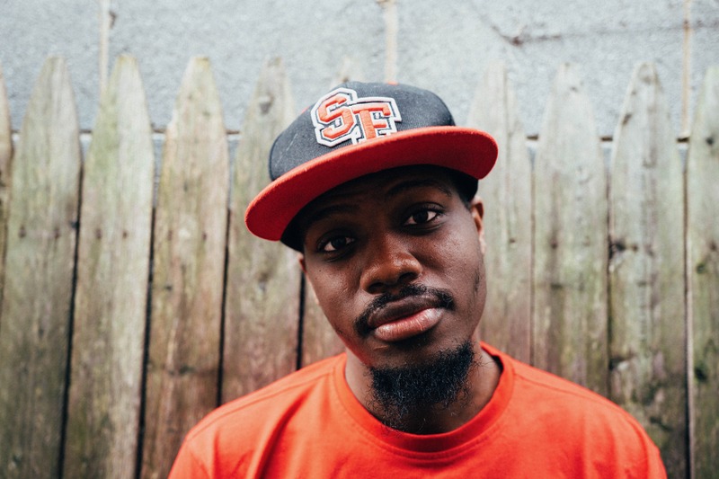 The photograph captures a young man with a serious expression, framed against a rustic wooden fence that adds texture and depth to the image. The muted light casts gentle shadows, emphasizing his features and the vibrant red of his shirt, creating a contemplative mood. His gaze and stance convey a sense of introspection, inviting viewers to ponder his thoughts and story.
