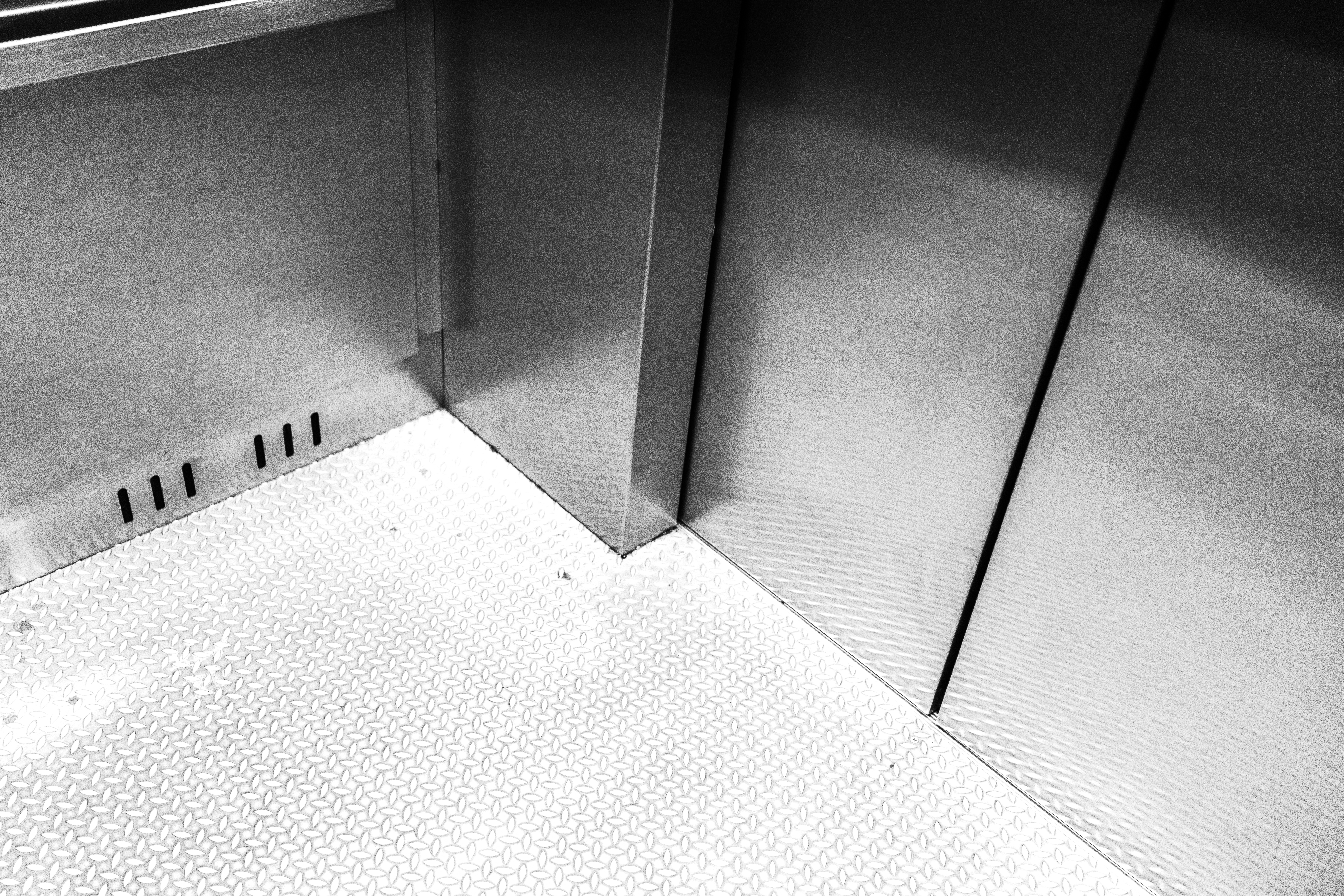 This photograph captures the stark interior of an elevator, emphasizing the smooth, reflective stainless steel walls and the patterned floor. The monochromatic palette evokes a sense of solitude and stillness, inviting contemplation. The composition highlights the intersection of lines and planes, creating a minimalist yet intriguing visual experience.