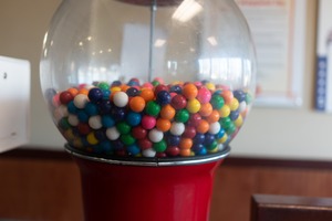 A vibrant gumball machine stands prominently, filled with an assortment of colorful gumballs that evoke nostalgia and whimsy. The soft lighting highlights the glossy surfaces of the candies, creating a playful and inviting atmosphere. The composition draws the eye to the rich hues, suggesting childhood joy and simple pleasures waiting to be enjoyed.