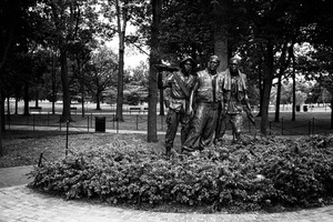 The photograph features a bronze statue depicting three soldiers standing together in a verdant park, surrounded by lush greenery. The overcast sky casts a somber light on the scene, enhancing the solemnity of the soldiers’ expressions and the overall mood of remembrance. The composition draws the viewer’s eye towards the details of the statues, while the natural elements create a reflective atmosphere.