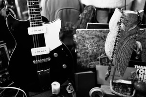 A black and white composition showcases an electric guitar as the central subject, surrounded by an eclectic array of objects including an intricately carved owl and various books. The soft lighting adds depth, highlighting the textures and creating a nostalgic, artistic atmosphere that invites contemplation of both music and memory.