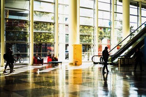 The photograph captures a spacious, modern atrium bathed in natural light, highlighting the interplay of shadows and reflections on the polished floor. Two figures sit in a vibrant red seating area, contrasting with the bustling movement of others traversing the space. The overall mood is dynamic yet serene, inviting contemplation amidst the urban backdrop.
