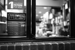 This black-and-white photograph captures the inviting glow of a McDonald's drive-thru window, highlighting its 'OPEN ALL NIGHT' sign. The soft focus of the background creates an atmosphere of warmth and nostalgia, suggesting comfort food is just a moment away, while the stark contrast of the brick and signs emphasizes the simplicity of the scene.