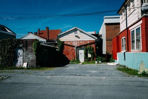 This photograph captures a quiet alleyway flanked by red-bricked buildings, with vibrant green vines clawing at the once-sterile walls. The bright blue sky overhead adds an air of tranquility, contrasting with the urban decay, while the soft sunlight gently illuminates the scene, enhancing its serene mood. Subtle details like the power lines and the gravel path lead the viewer's eye through this peaceful yet neglected space.