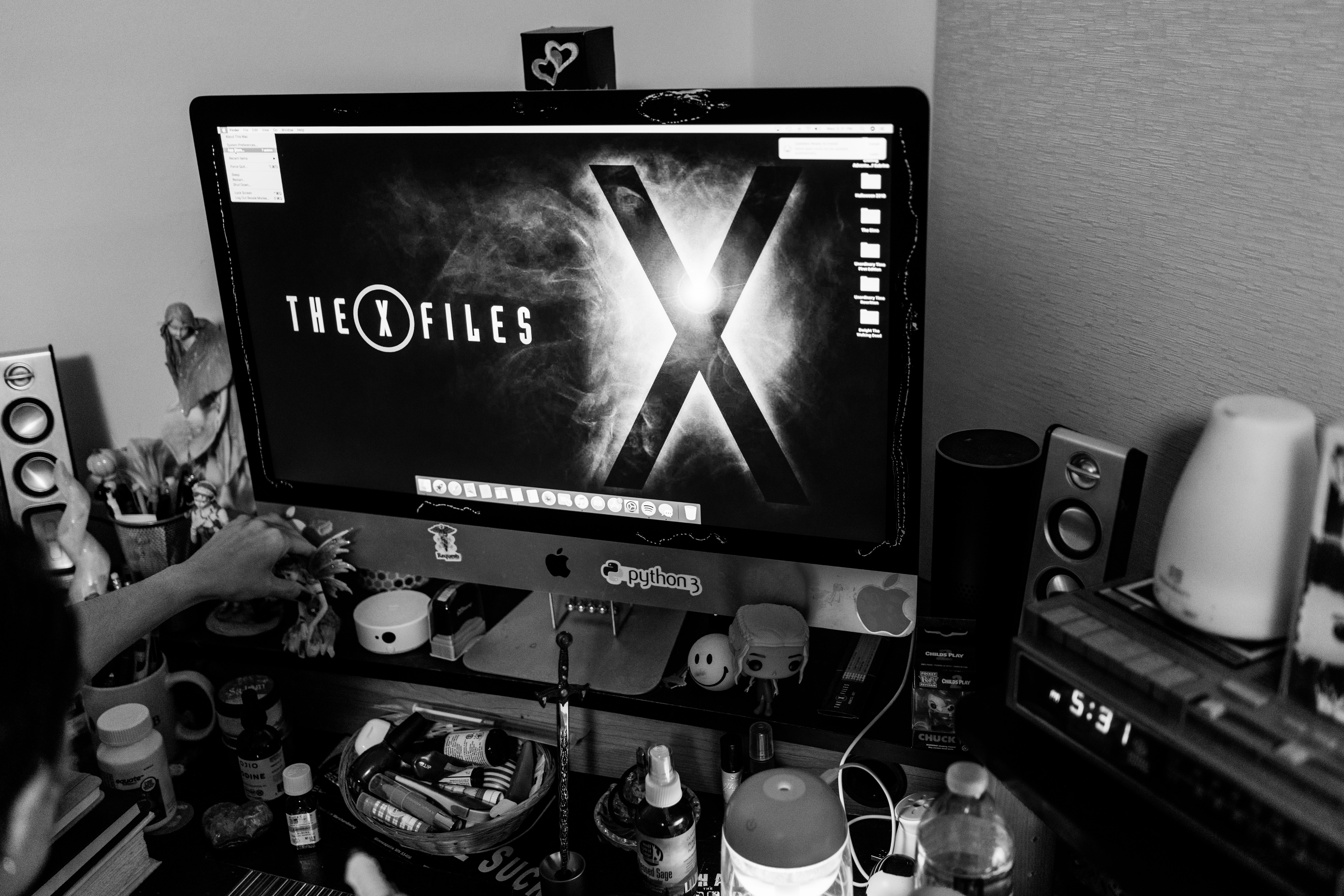 In a moody black-and-white setting, a computer screen displays the iconic 'The X-Files' logo, casting dramatic light onto a cluttered desk filled with personal items and nostalgic figures. The composition captures a moment of engagement, with a hand reaching towards the screen, encapsulating a sense of curiosity and intrigue amidst the chaos of everyday life.