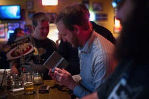 In a bustling bar, a man intensely studies a handheld device, his expression revealing curiosity and anticipation. The warm, dim lighting casts a nostalgic glow over the scene, illuminating the faces of his friends, who share in the moment with amused interest. With the vibrant yellow background and scattered memorabilia, the composition conveys a sense of camaraderie and joy amidst the lively atmosphere.