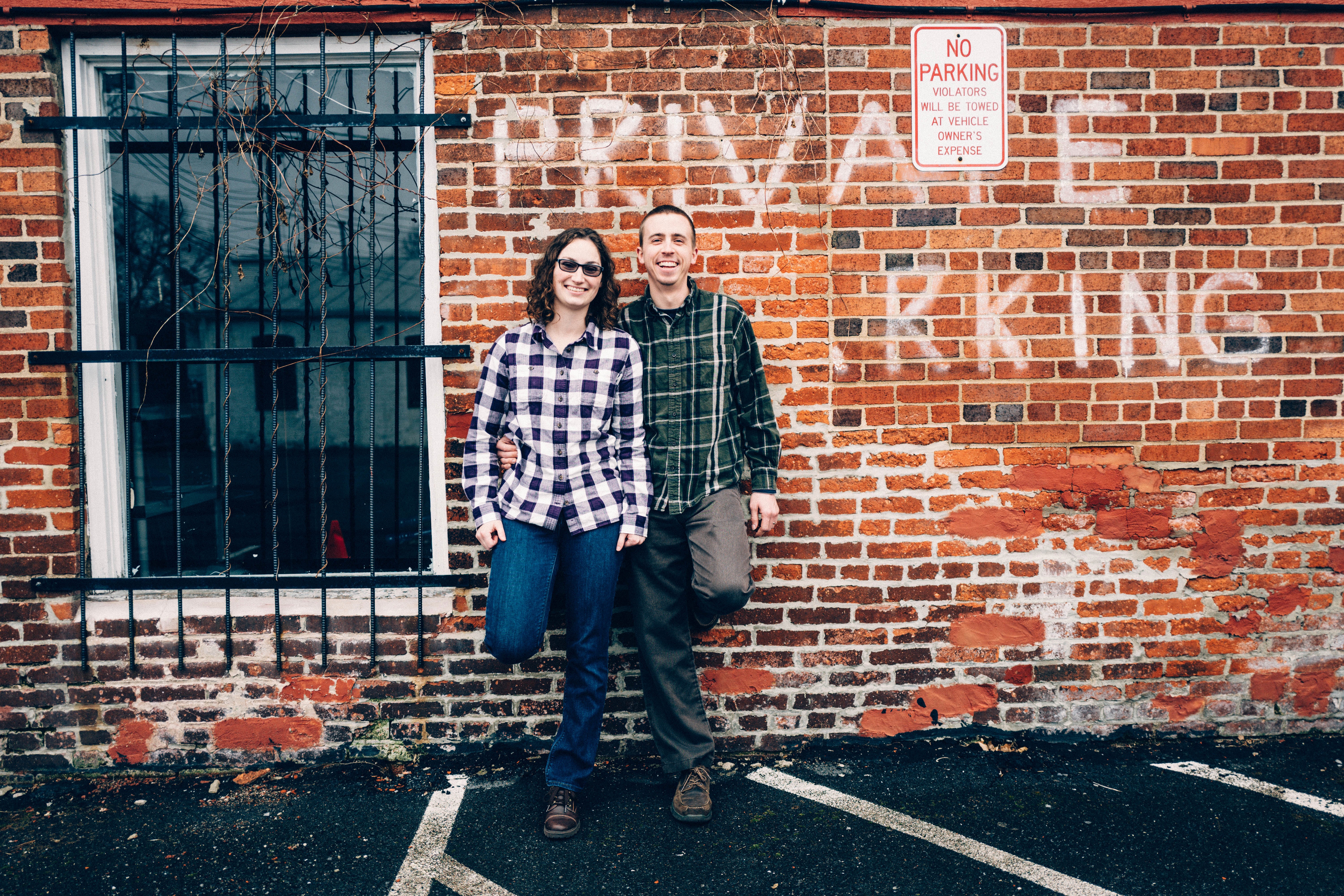 In this candid moment, two friends lean casually against a rustic brick wall adorned with faded parking signs, exuding warmth and camaraderie. The muted colors of their plaid shirts complement the rough texture of the background, while the natural light highlights their smiles, creating a relaxed and inviting atmosphere. The juxtaposition of urban decay with personal connection adds depth to the composition, evoking a sense of familiarity and nostalgia.
