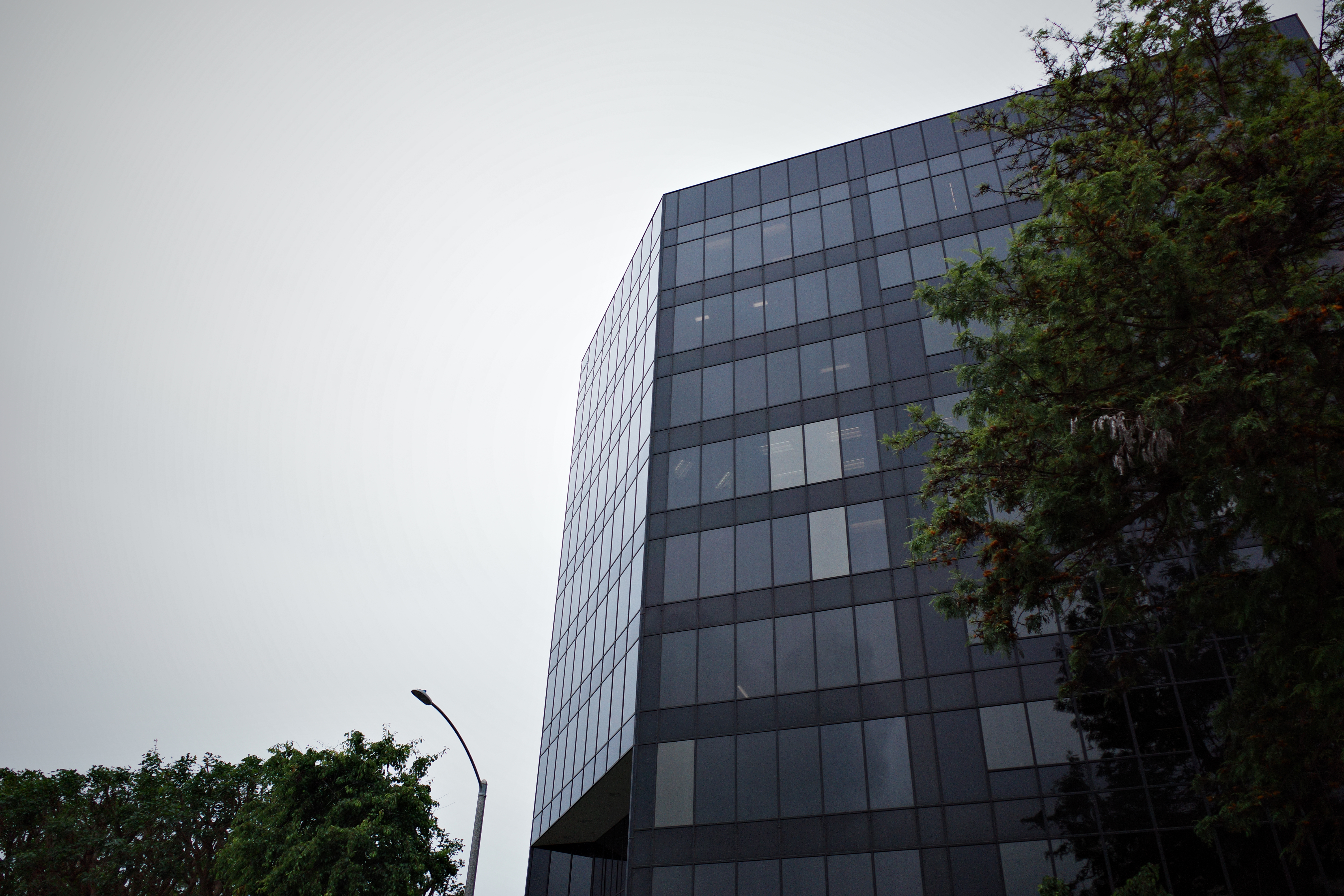 The photograph captures a modern glass building, leaning slightly upward, with its reflective surface mirroring the muted sky. Surrounding greenery softens the stark lines of the architecture, lending a sense of contrast between nature and the urban landscape. The overcast lighting contributes to a somber yet contemplative mood, inviting viewers to ponder the relationship between the man-made and the natural world.