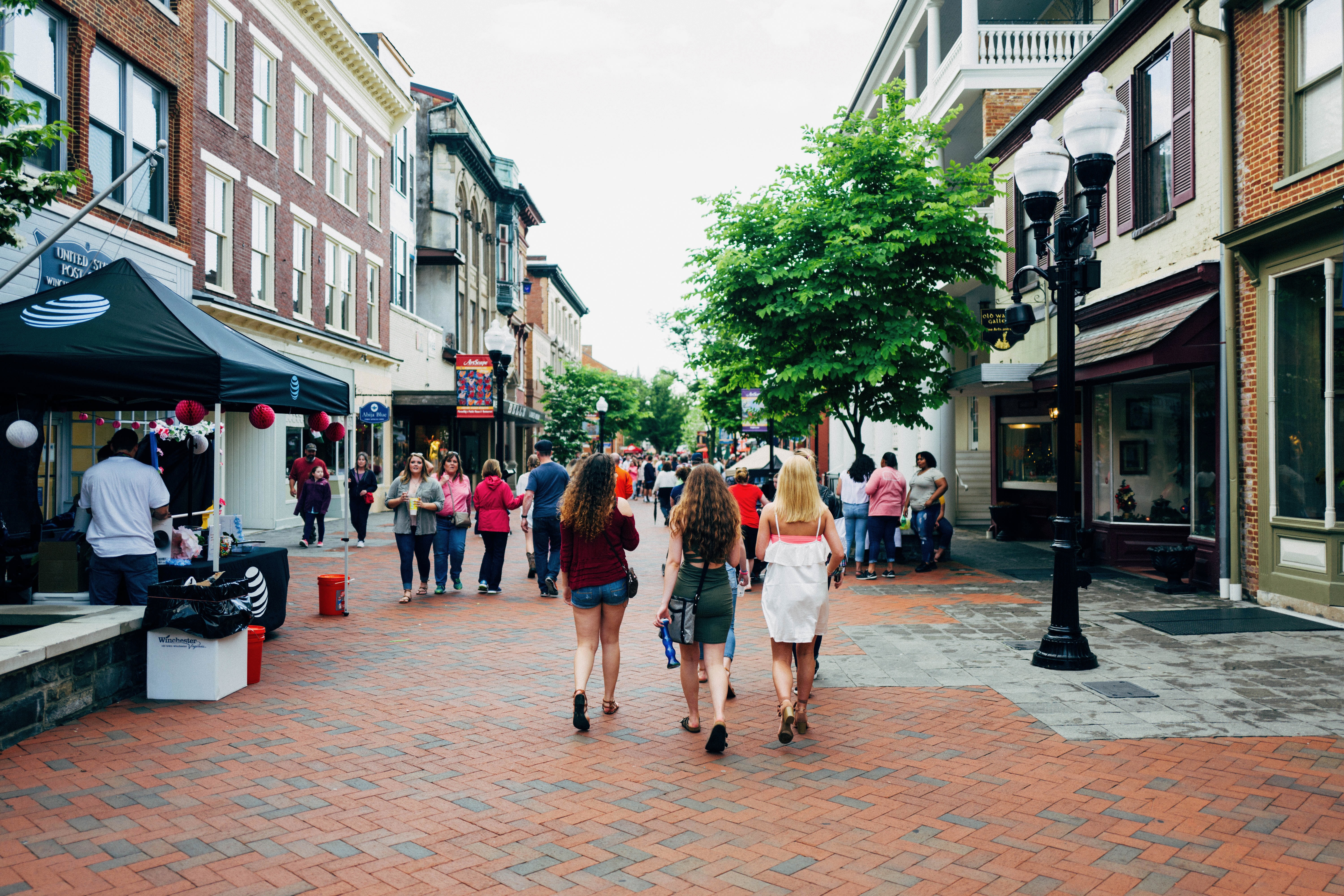 The photograph captures a vibrant street scene filled with groups of people and an inviting atmosphere. The three women in the foreground stroll leisurely, their relaxed demeanor echoing the warm community vibe, while subtle overcast lighting enhances the rich colors of the historic buildings. The composition draws the eye down the winding path, inviting viewers to explore the lively shops and tall trees lining the way.