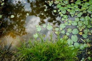 The photograph captures a serene pond surface, adorned with floating lily pads that mirror the soft, cloudy sky above. Lush green grass frames the bottom, inviting a sense of tranquility and connection to nature. The subdued lighting enhances the reflective quality of the water, creating a harmonious blend of elements that soothe the soul.