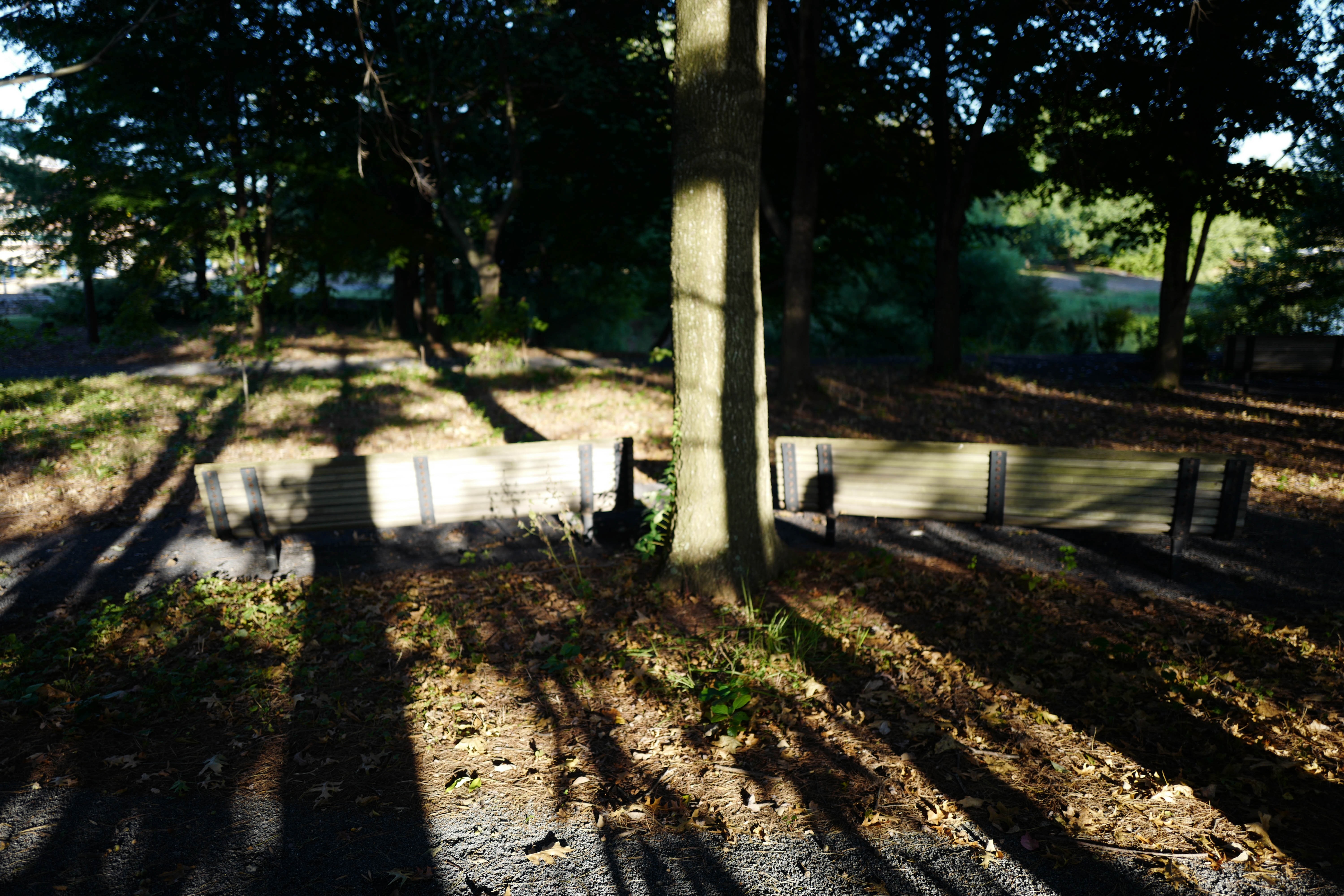 In a serene park setting, sunlight filters through the trees, casting elongated shadows across the ground. A solitary tree stands as the focal point, surrounded by benches that invite moments of reflection. The contrast between light and shadow creates a tranquil mood, evoking a sense of calm and solitude in nature's embrace.