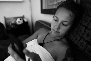 The photograph captures a contemplative moment of a young woman lounging on a sofa, wrapped in a towel and absorbed in her phone. The soft, diffused lighting enhances the serene atmosphere, while the monochrome tones lend a timeless quality to her tranquil expression. The framing emphasizes her relaxed posture, drawing attention to the contrast between her stillness and the energetic world captured within her screen.