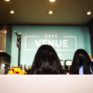 In this cozy cafe setting, two individuals sit side by side, their long hair cascading down their backs, creating a sense of anonymity and tranquility. The soft, diffused light casts a warm glow over the scene, while the pastel blue wall marked with 'CAFE VENUE' adds an inviting touch. With a focus on simplicity and a hint of introspection, the composition captures a moment of quiet connection amidst the bustling ambiance of the cafe.