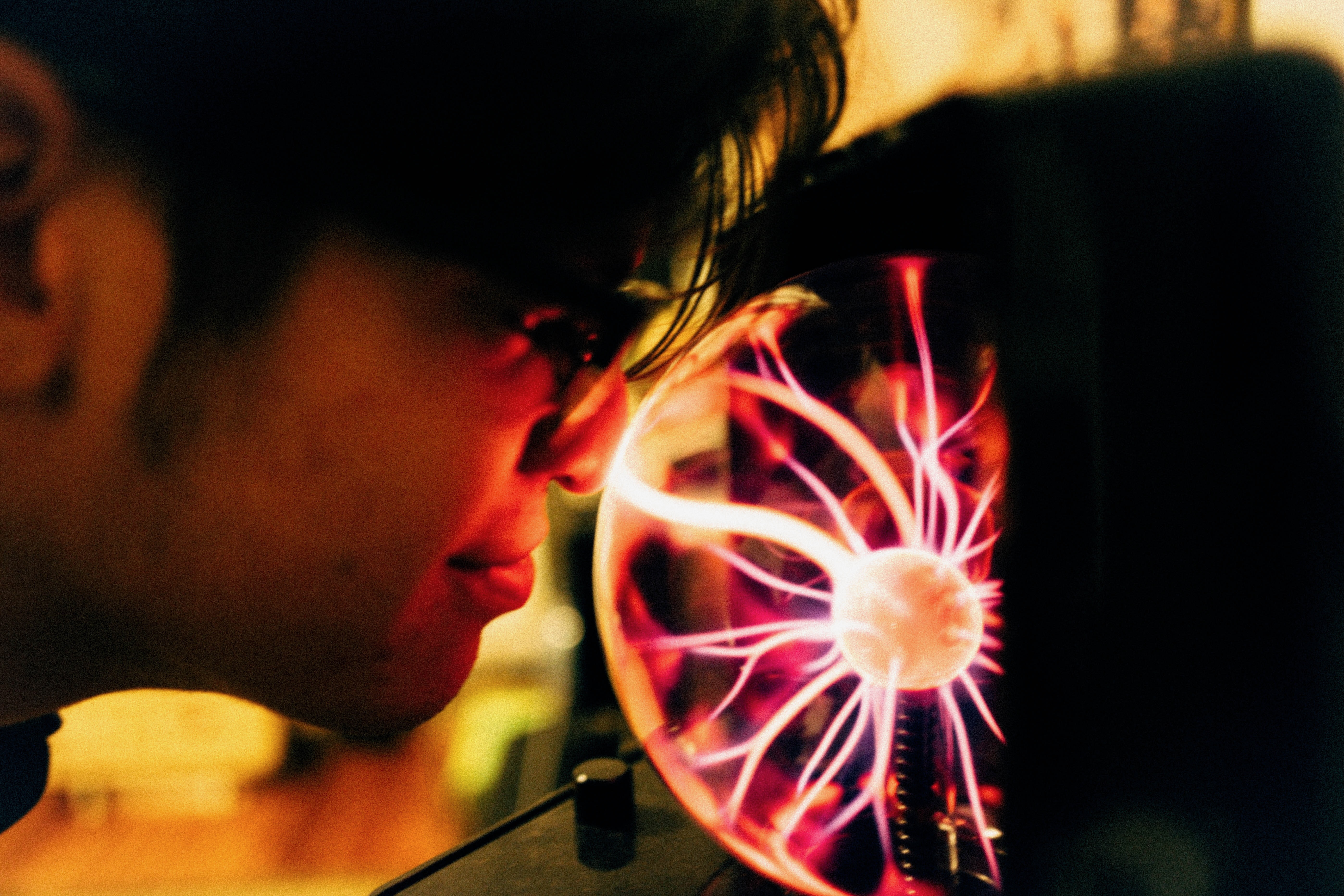 A figure leans intently toward a plasma globe, their face illuminated by the vibrant electric arcs dancing within. The mood is one of wonder and fascination, magnified by the warm and moody lighting that casts soft shadows. The close-up composition draws the viewer into this intimate moment of exploration and discovery.