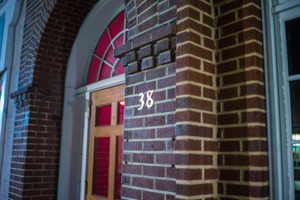 This photograph captures the inviting charm of a brick doorway, highlighted by the warm glow of interior lighting. The bold number '38' stands out against the textured wall, creating a focal point that draws the eye. The soft, ambient light casts an intimate mood, hinting at the stories behind this threshold.