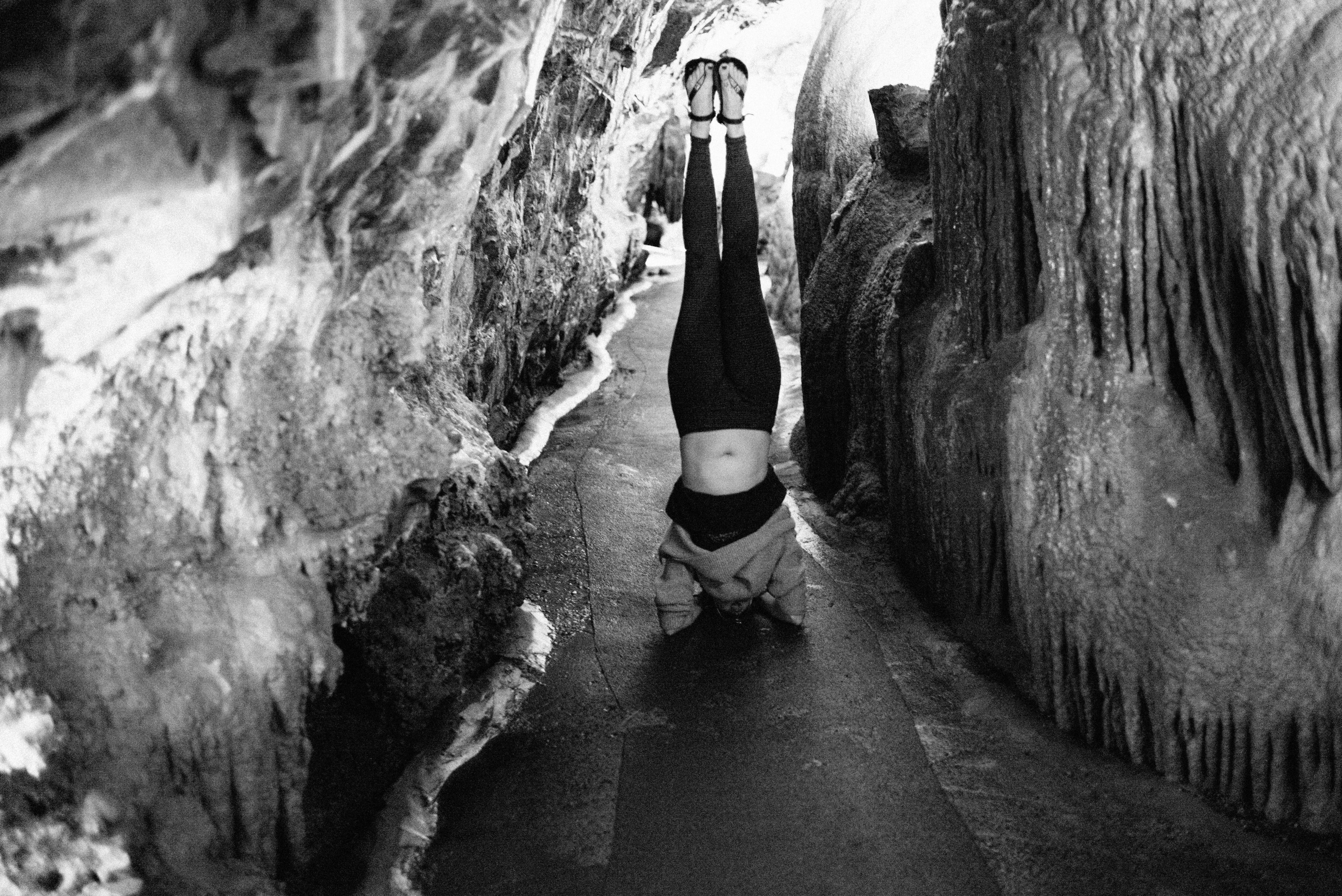 A woman performs a headstand in a narrow, illuminated cave, her silhouette stark against the rugged stone walls. The black-and-white composition evokes a sense of tranquility and strength, while the contours of the rock formations create a dramatic backdrop. Soft light filters through, casting intricate shadows and enhancing the serene, introspective mood of the scene.
