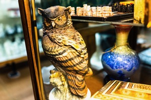 This photograph captures a beautifully crafted wooden owl statue, exuding a sense of wisdom and strength. The warm lighting softly highlights its intricate details, giving the scene a cozy, inviting atmosphere. Behind the owl, blurred objects and colors suggest a rich collection of curiosities, enhancing the intimate mood of a treasured antique shop.
