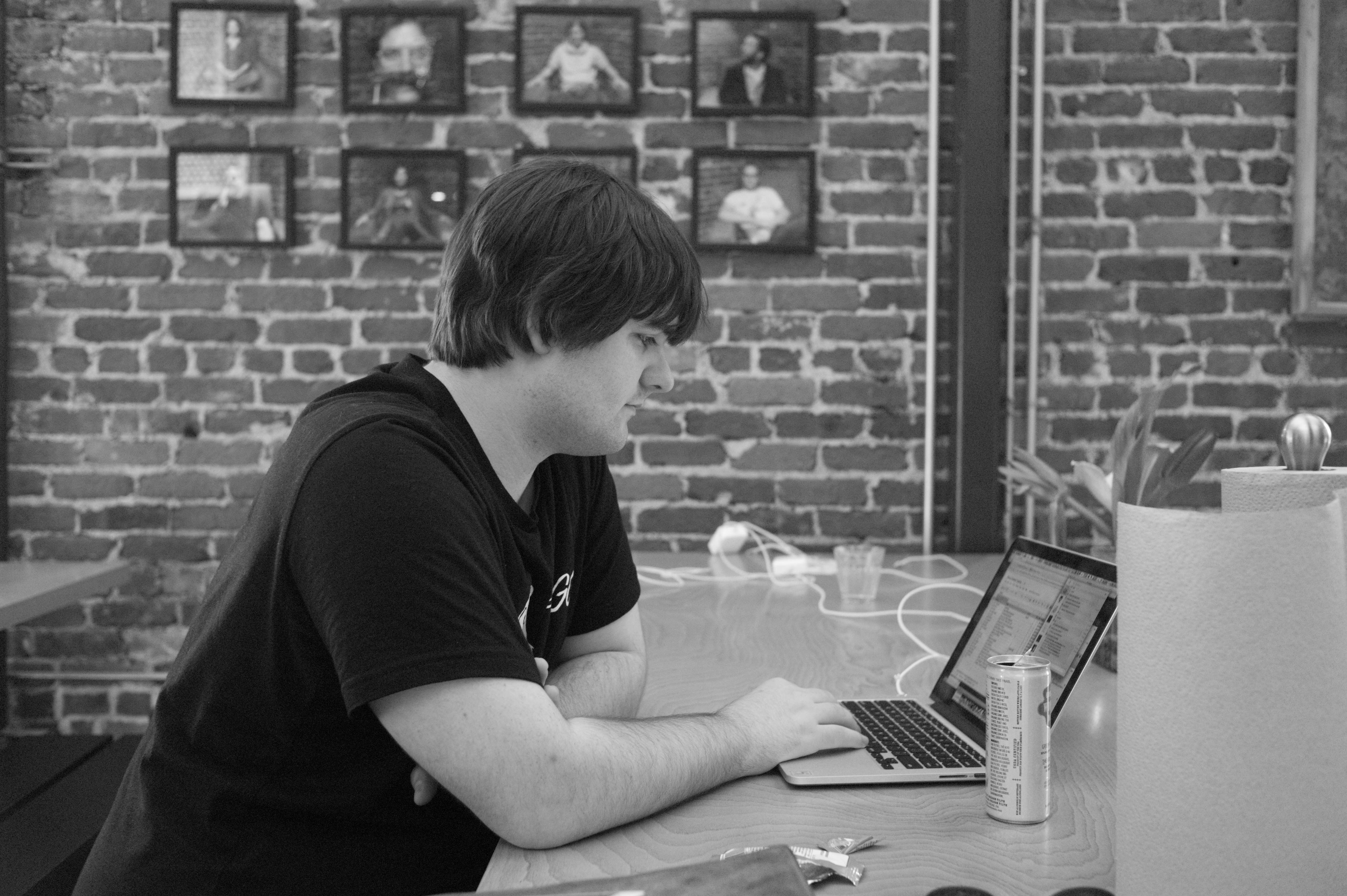 In a cozy, rustic setting accentuated by exposed brick walls, a young man sits engrossed in his laptop, illuminated by soft, ambient light. The composition foregrounds his concentration against a backdrop of framed photographs, blending a sense of personal contemplation with community engagement. The black-and-white tones amplify the thoughtful mood, inviting viewers to reflect on the silent stories of both the subject and the wall behind him.