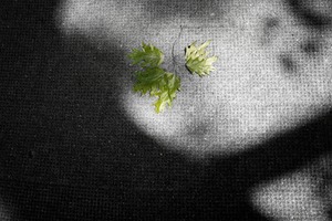 A solitary green leaf rests on a textured dark surface, creating a striking contrast between the vibrant foliage and the muted background. The interplay of light and shadow enhances the simplicity of the composition, evoking a sense of calm and introspection. This image captures the quiet beauty of nature, subtly reminding us of resilience amidst darkness.