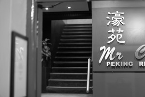 This black-and-white photograph captures the entrance of a restaurant, featuring a prominent sign reading 'Mr. Peking.' The dimly lit staircase hints at an inviting but mysterious atmosphere, guiding the viewer's eye upward and suggesting a journey into an intimate dining experience.