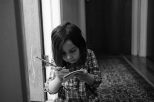 In a softly lit hallway, a young child sits absorbed in the act of writing, a pencil gripped tightly in hand. The black-and-white tones enhance the intimate atmosphere, capturing the concentration and wonder of childhood creativity. The warm textures of the wood and patterned carpet contrast subtly with the child's focus, evoking a sense of stillness and imagination.