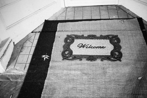 The photograph captures a vintage-style doormat, artistically inscribed with the word 'Welcome,' positioned at a doorway. The black and white tones lend a nostalgic feel, enhancing the inviting atmosphere. Subtle details, like fallen leaves and textured tiles, add depth and warmth to the composition.