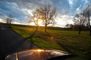 The photograph captures a tranquil landscape at sunset, where golden rays of sunlight break through the clouds, illuminating the grassy field and casting long shadows from the trees. Soft hues of orange and blue blend in the sky, creating a peaceful and reflective mood. The composition draws the eye along the winding road, inviting the viewer to explore the serene beauty of nature in this moment.