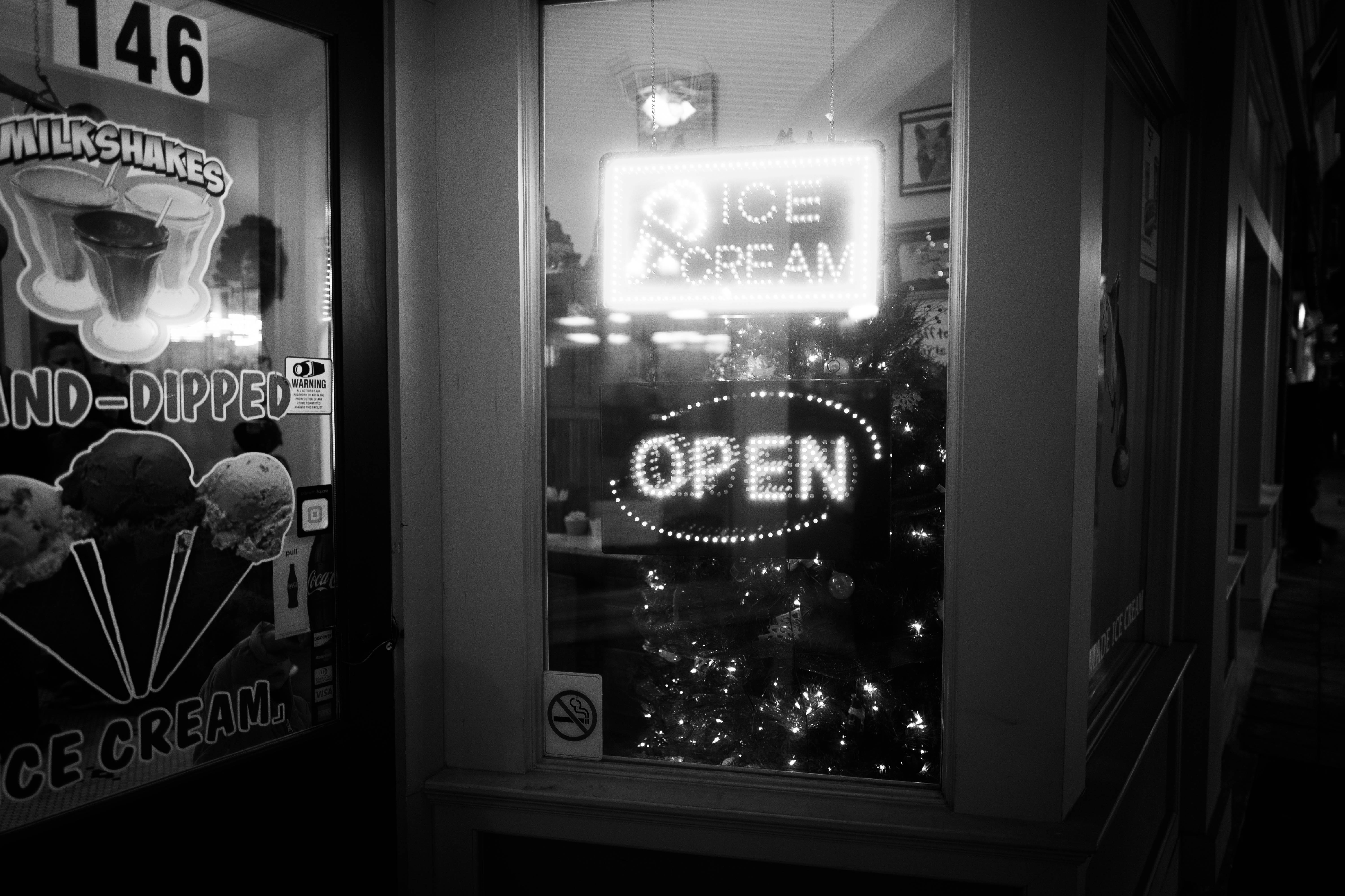 This photograph captures the inviting glow of an ice cream shop's neon signs through a window, set against a backdrop of a dimly lit street. The contrast of light and shadow creates a cozy, nostalgic atmosphere, drawing the viewer's gaze to the playful allure of sweet treats. A decorative Christmas tree adds a touch of warmth and festive spirit to the scene, enhancing the inviting charm of the establishment.