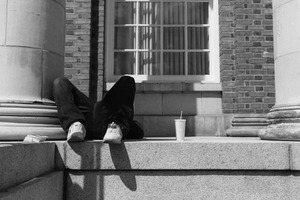 The photograph captures a figure lounging against grand architectural pillars, emphasizing a moment of stillness amidst urban life. Drenched in soft light, the black-and-white composition enhances the contrasts, drawing attention to the subject's casual repose and the surrounding textures. A discarded drink lies nearby, hinting at a paused routine in this serene, solitary scene.